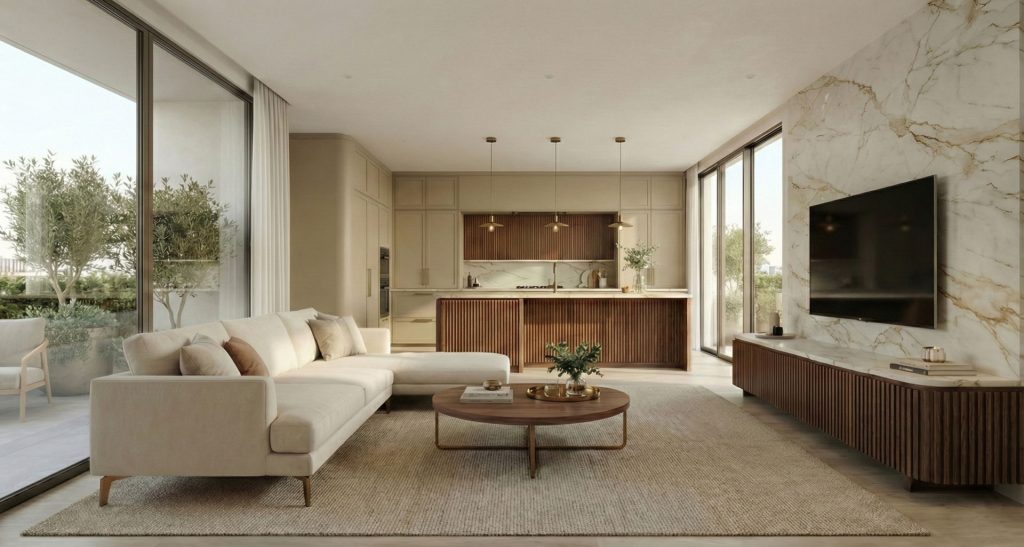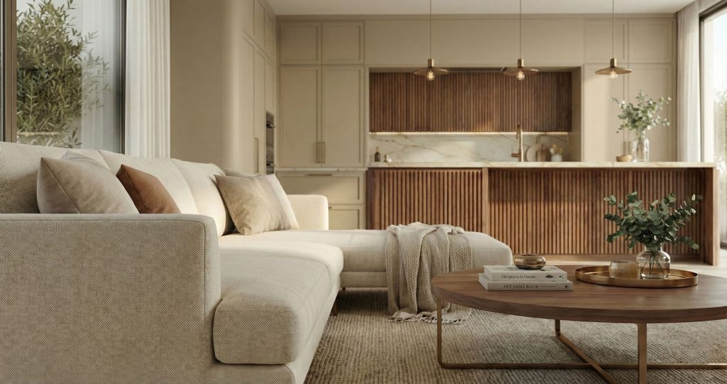 A nappali–konyha egybenyitott tere világos és tágas, nagy üvegfelületekkel, amelyek bőséges természetes fényt engednek be. A bézs színű kanapé puha megjelenésével és egyszerű formavilágával nyugalmat sugároz, jól illeszkedik a neutrális környezethez. A texturált szőnyeg és a fa dohányzóasztal tovább erősítik az otthonos, mégis elegáns hangulatot.