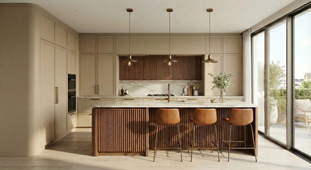A konyha központi eleme a fa lécezett burkolattal kialakított konyhasziget, amely karakteres, mégis finom részletként jelenik meg a térben. A világos, márványhatású munkalap elegáns kontrasztot alkot a meleg tónusú fával. A szigethez társuló barna bőrfelületű bárszékek prémium érzetet keltenek, miközben funkcionalitásuk révén a mindennapi használatot is szolgálják.