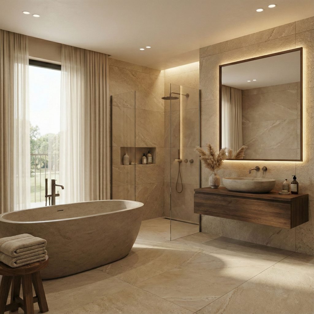 A fürdőszoba spa-jellegű, nyugodt menedékként jelenik meg. A travertin kőburkolatok, a szabadon álló kád és a lebegő fa mosdószekrény természetes eleganciát sugároznak. A rejtett világítással ellátott tükör és a letisztult üveg zuhanyfal modern, mégis időtálló megoldás.