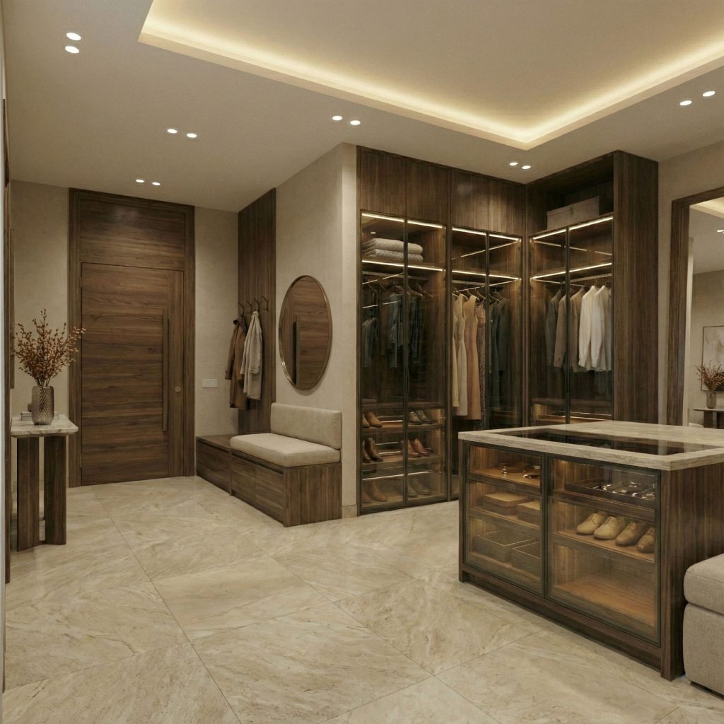 A gardrób tér prémium hangulatú, szinte butik jellegű kialakítást kapott. A sötétebb fa furnér felületek, az üvegajtós szekrények és a beépített LED-világítás átlátható, rendezett tárolást biztosítanak. A központi sziget vitrines megoldása ékszerek és kiegészítők számára készült, a kárpitozott ülőfelület pedig kényelmes használatot ad. Az íves tükrök és a finom mennyezeti fények tovább emelik a tér exkluzivitását.