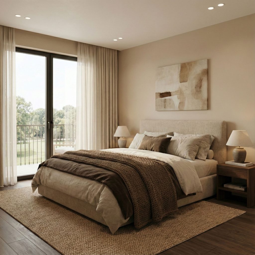 A hálószoba puha textíliákkal, bézs árnyalatokkal és meleg fa kiegészítőkkel berendezett, intim tér. A kárpitozott ágy, a természetes fény és a minimalista dekoráció nyugalmat és pihenést szolgál.