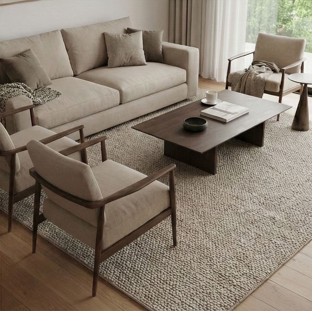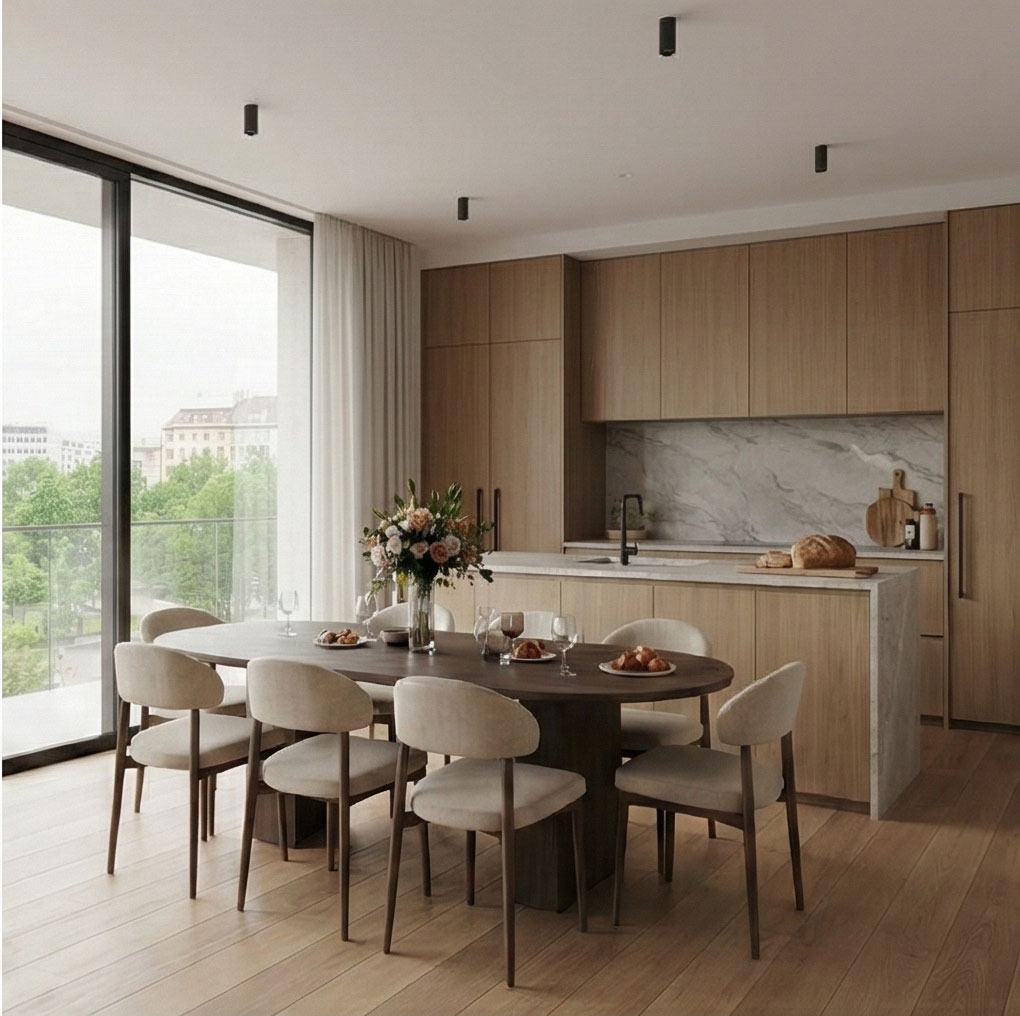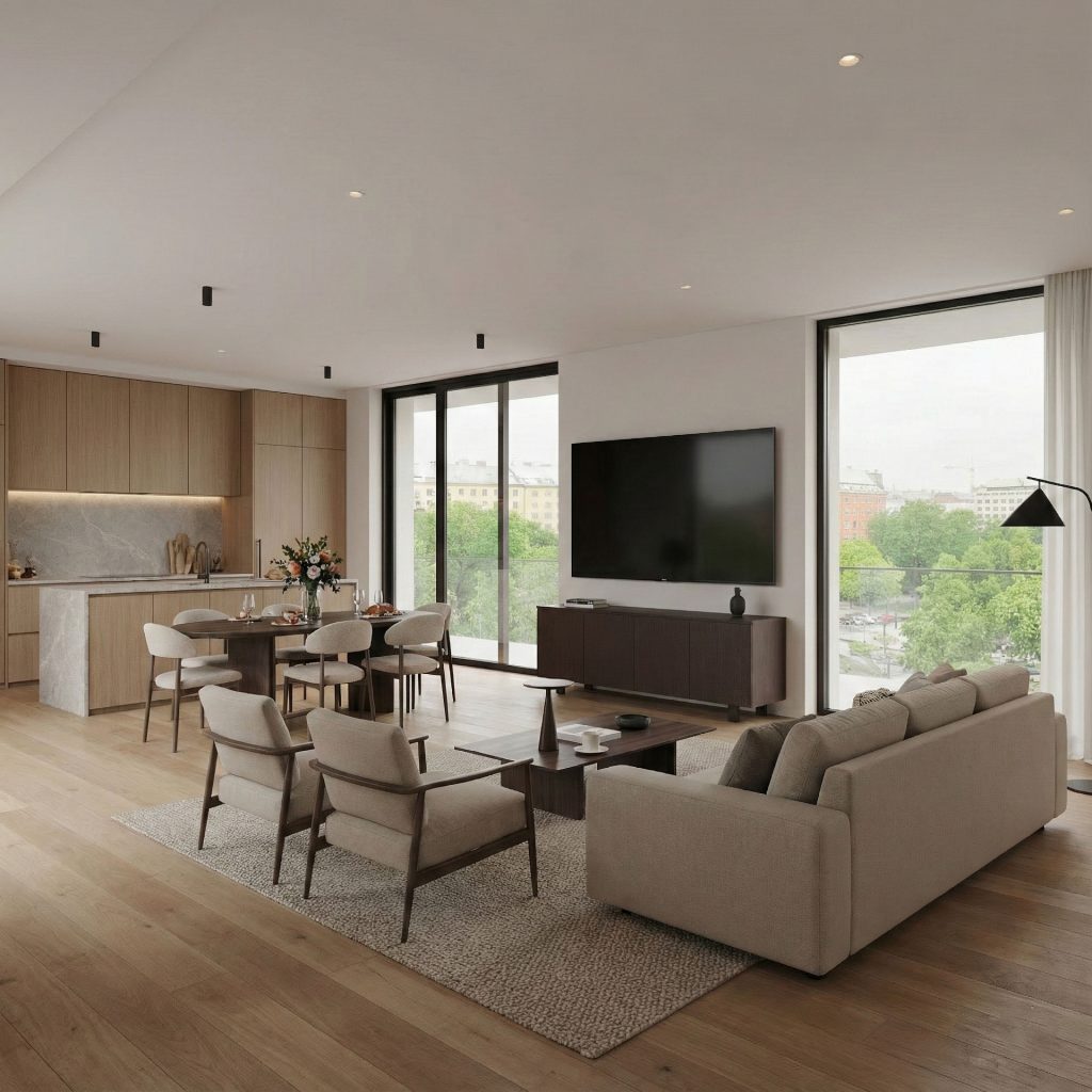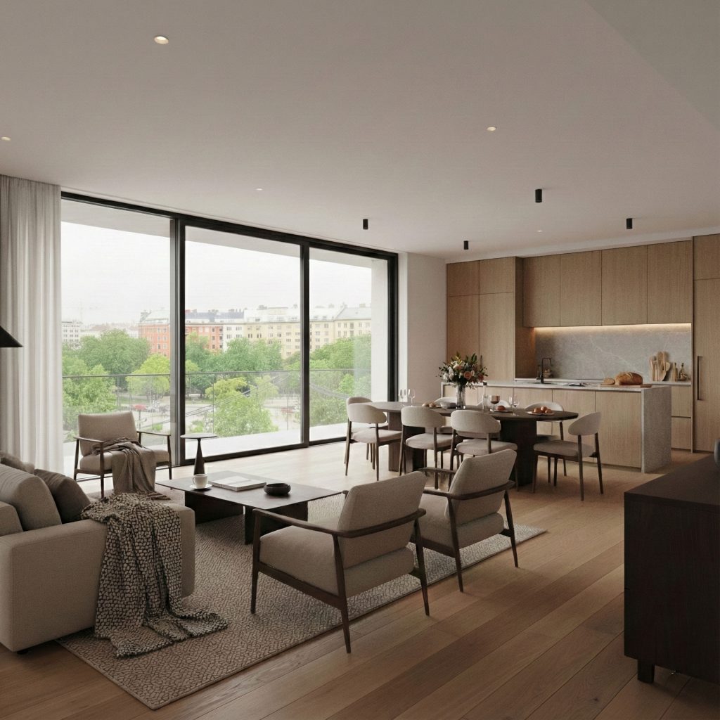 A nappali–étkező–konyha egybenyitott tere világos és nagyvonalú. A padlótól plafonig érő üvegfelületek városi panorámát és bőséges természetes fényt biztosítanak. A bézs és meleg fa tónusokra épülő színpaletta nyugodt, elegáns atmoszférát teremt. A letisztult formavilágú ülőbútorok, a texturált szőnyeg és a visszafogott kiegészítők harmonikus összképet adnak. A konyha frontjai és a konyhasziget természetes fa burkolata finoman simul a térbe, a rejtett világítás pedig hangsúlyozza az anyagok minőségét.